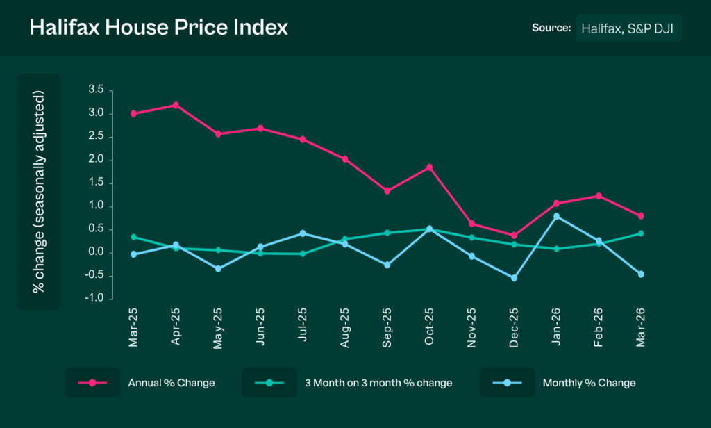 UK house prices fell slightly in March, reversing the modest gains seen earlier in the year. Halifax reports the average property price now stands at £299,677, with annual growth also easing as the housing market loses momentum following a stronger start to 2026.